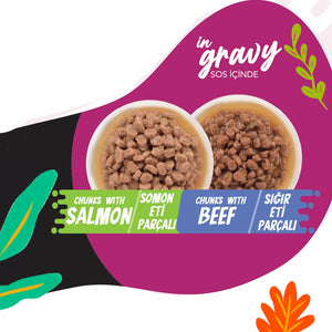 Kısırlaştırılmış yetişkin kediler için özel olarak formüle edilmiş, 2 adet somonlu ve 2 adet sığır etli jöleli yaş mama porsiyonundan oluşan, tam ve dengeli beslenme sağlayan mama seti.