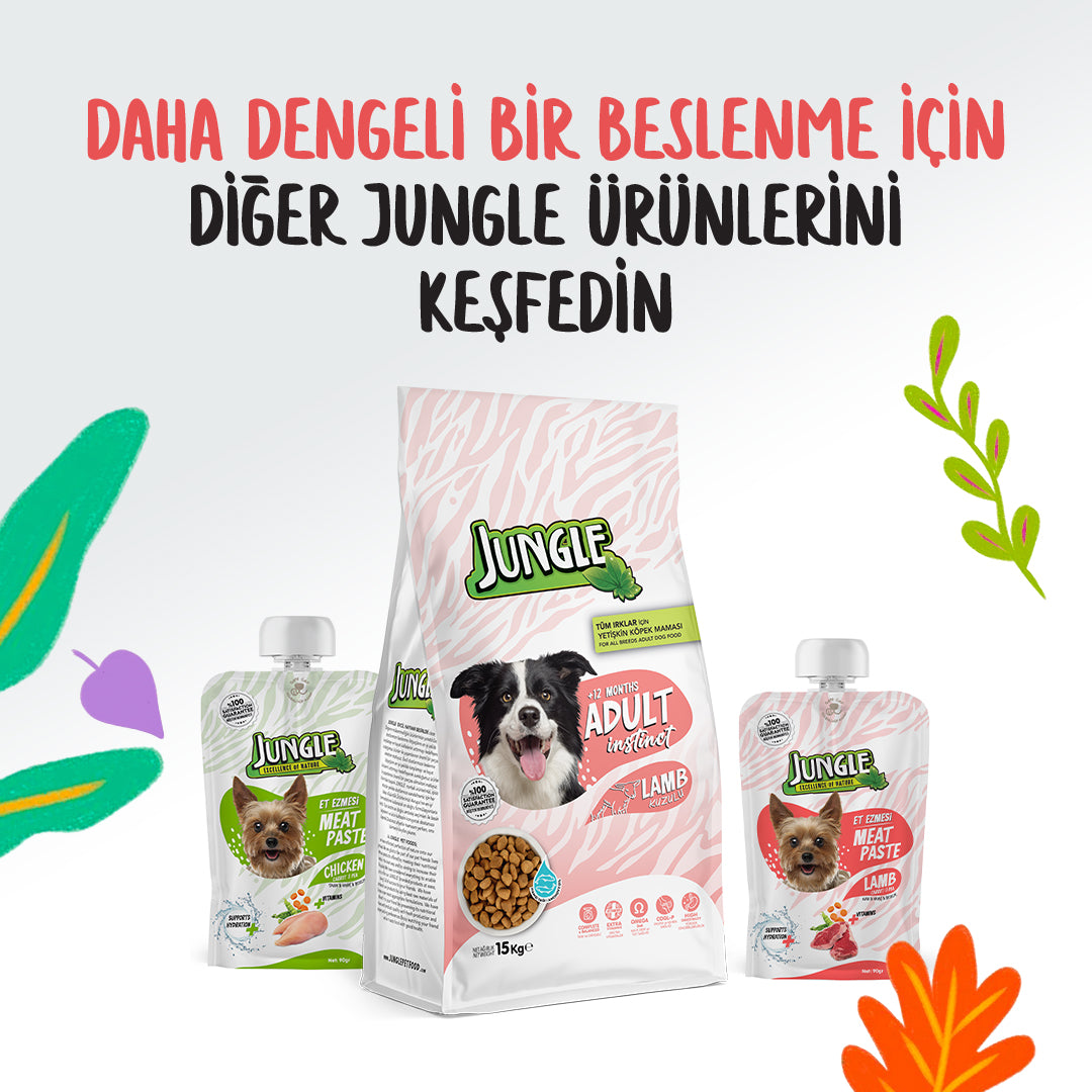 Köpekler için özel olarak formüle edilen Jungle Tasty Meat Paste, kuzu eti, havuç ve bezelye içeriğiyle lezzetli, sağlıklı ve kolay tüketilebilir bir ödül mamasıdır.