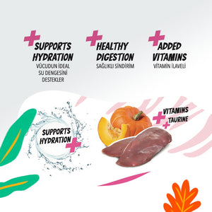 Ördek eti, tavuk, balkabağı ve bonito balığı ile hazırlanmış, kolay tüketilebilir kıvamda, tüm yaş gruplarından kediler için uygun, lezzetli ve tamamlayıcı bir et ezmesidir.