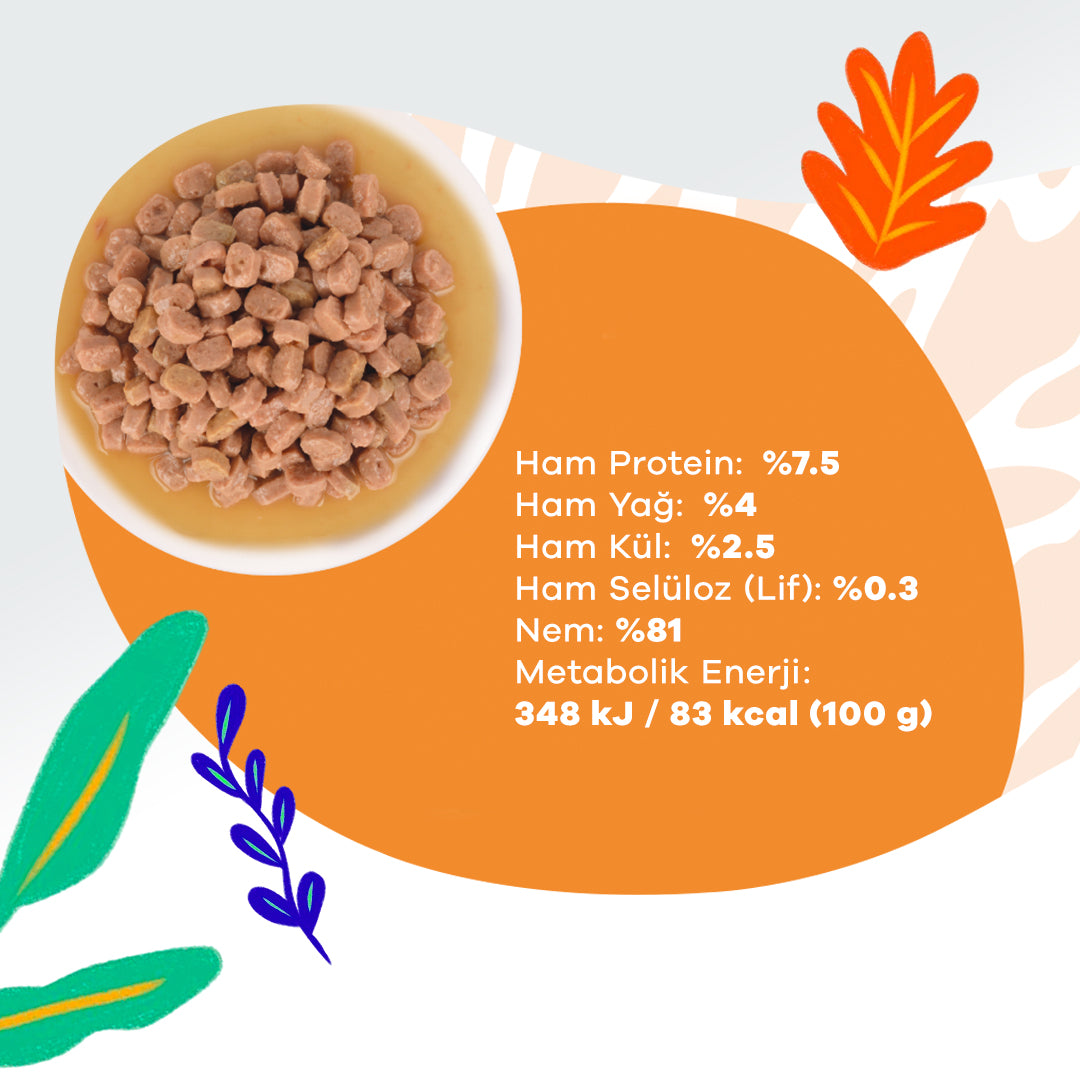 Kısırlaştırılmış yetişkin kediler için özel olarak formüle edilmiş tavuk etli gravy (soslu) yaş mama; tam ve dengeli beslenme sağlar, ideal kilosu korunmasına yardımcı olur.