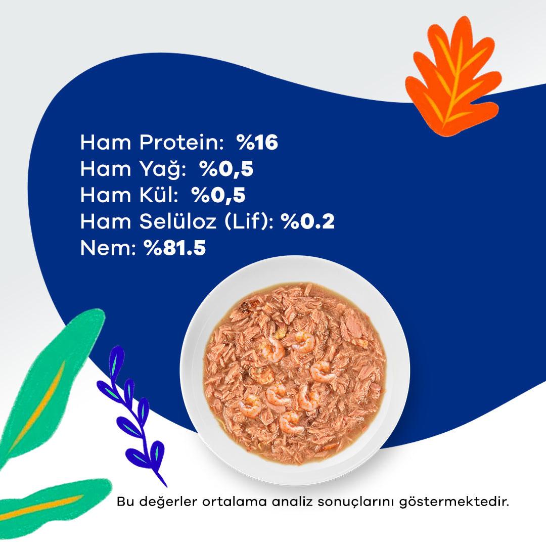 Mineral ve vitaminlerle zenginleştirilmiş tiftiklenmiş ton balığı ve karides içeriğiyle, yetişkin kedilerin günlük enerji ihtiyacını karşılayan, dengeli ve sağlıklı tamamlayıcı bir besindir.