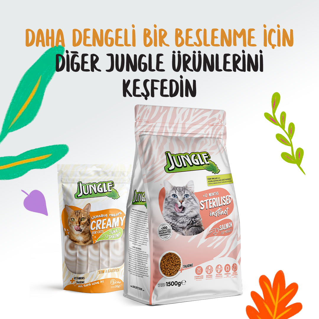 Lezzetli somon ve karides parçalarıyla hazırlanan Jungle Somon & Karidesli Kedi Konservesi, yetişkin kediler için yüksek proteinli, dengeli ve sindirimi kolay bir beslenme sunar.