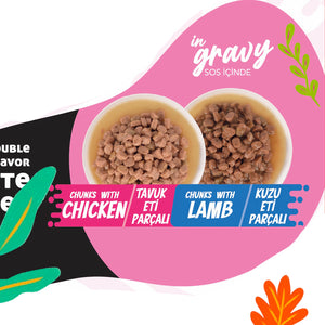 Tavuk ve kuzu etli iki farklı porsiyon seçeneğini içeren, jöle kıvamında hazırlanmış, tüm ırklardan yavru kediler için tam ve dengeli beslenme sağlayan yaş mama seti.